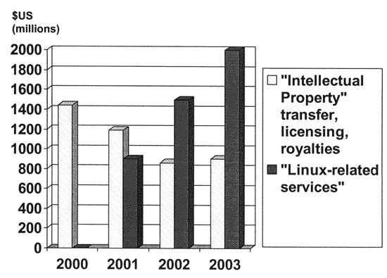 图 2.1 显示了专利使用费、许可证和销售额在 IBM 收入中的相对比重,以及该公司所称的来自 “Linux 相关服务 “的收入。在四年的时间里,Linux 相关服务类别从几乎没有收入,到成为美国专利产量最高的公司所有专利相关来源收入的两倍。据 IBM 自述,它向自由软件开发者投入了超过 10 亿美元,雇用程序员帮助开发 Linux 内核和其他自由软件,并向自由软件基金会捐赠专利。这为公司的服务器业务提供了更好的操作系统,使服务器更好、更快、更可靠,从而对消费者更有价值。参与自由软件开发还使 IBM 得以与其客户发展服务关系,在自由软件的基础上提供客户特定的解决方案。换句话说,IBM 将供应方和需求方的战略结合起来,采用非专有商业模式,每年为公司创造 20 多亿美元的业务。这样的的战略可能称之为共生有些夸张,但可以肯定的是:这是与自由软件是相互促进的。