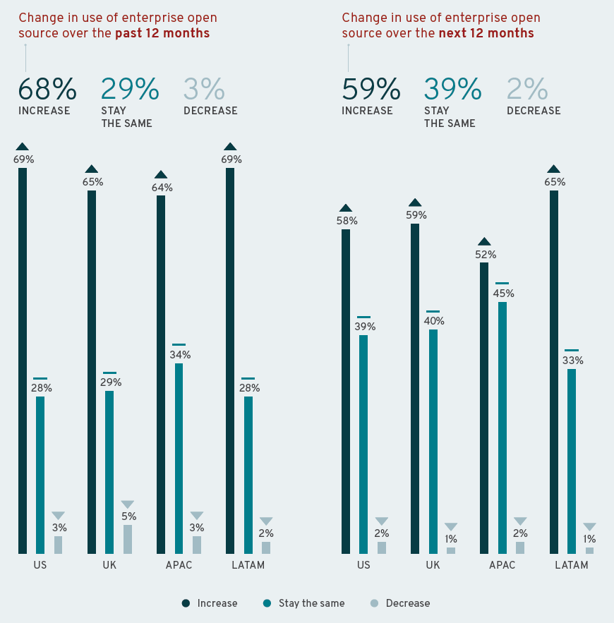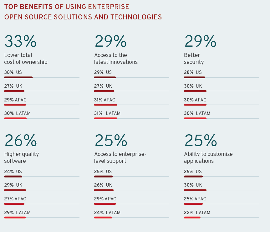 该报告对来自世界各地 950 位 IT 领导者进行访谈后的成果,调查区域包括美国、英国、拉丁美洲及亚太地区,旨在了解不同地理区域的企业开源概况。其中来自美国的有400位,来自英国的有150位,拉丁美洲的(Argentina、 Brazil、 Chile、 Colombia、 Mexico)有250位,以及说英语的亚太区(澳大利亚、新西兰、香港和新加坡)的150位。
