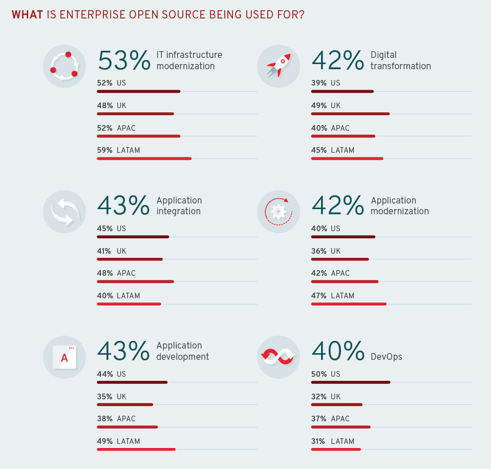 这就是我非常激动的和大家分享 “企业开源现状” 报告,(由红帽赞助),该报告详细介绍了开源解决方案如何以及为什么能以如此强劲的势头进入企业。也解释了客户转向使用开源工具实现 IT 现代化的一些方法。