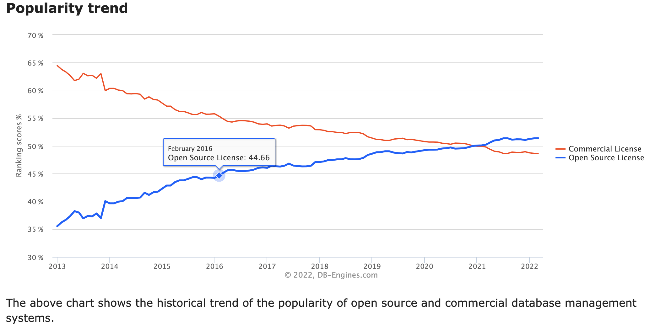 我们以服务或用户交互的视角去审视整个技术栈,我们便会发现没有那个商业服务是纯粹的使用完整的开源栈的,多少比例罢了,信任开源能够驾驭的,开源的比例就高些,比如互联网服务,强调业务多些,开源栈就使用的少些。但是整体来说,开源的比例是增长的。数据库的排名占比,或许就是一个非常好的案例: