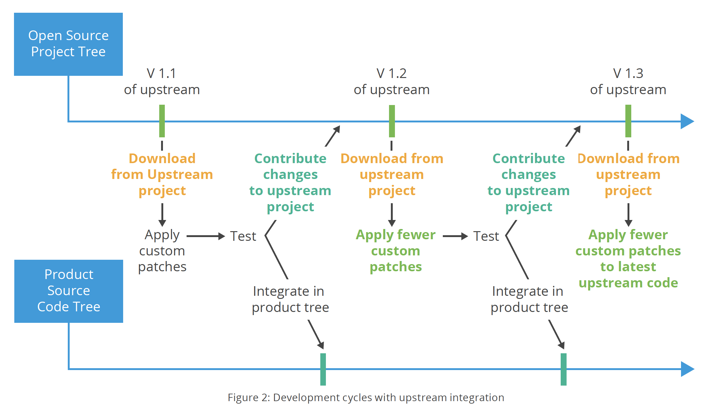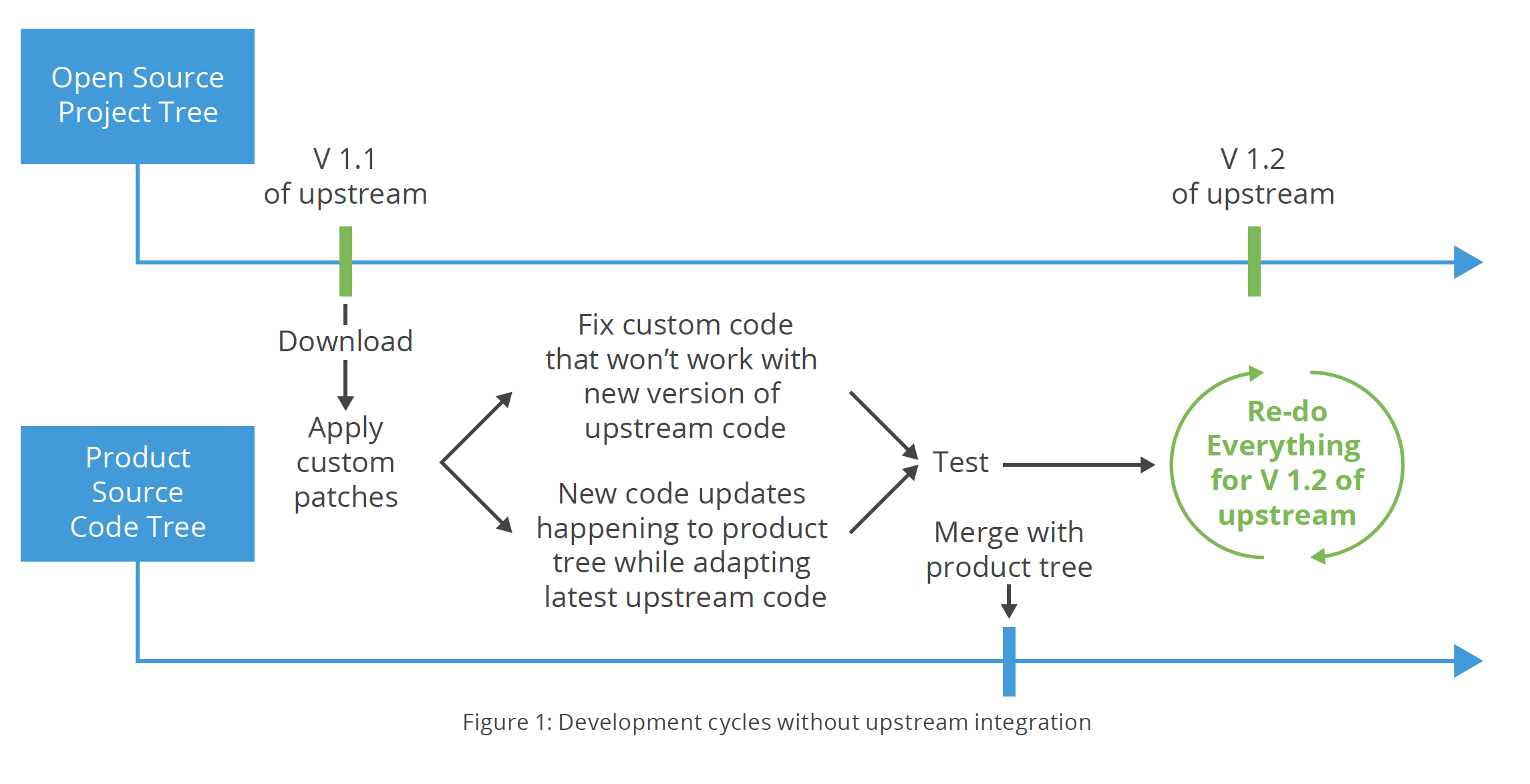 基于这个原理,当 fork 一款开源项目的时候,就要保持与其上游的同步,(除非上游不再更新)而且是不间断的,否则就会面临不断的补丁backporting[19],这是一项艰巨的任务,会牵扯项目中宝贵的资源来完成这件事,当积累到一定程度的时候,也就是版本相差悬殊的话,这么做的代价,不亚于一次重构。这就是巨大的技术债务的来由。