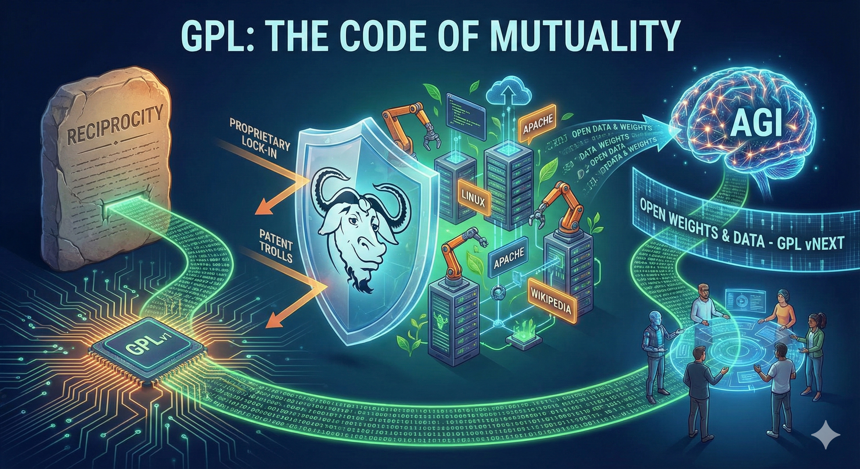 GPL 的伟大,在于它曾用法律的契约锁住了贪婪的利维坦,迫使它为人类的公地添砖加瓦。在 AGI 时代,我们必须再次祭出这一武器,捍卫人类认知的自由,防止智能成为少数人奴役多数人的工具。这不仅是关于软件的战争,这是关于人类心智自由的宪法时刻。