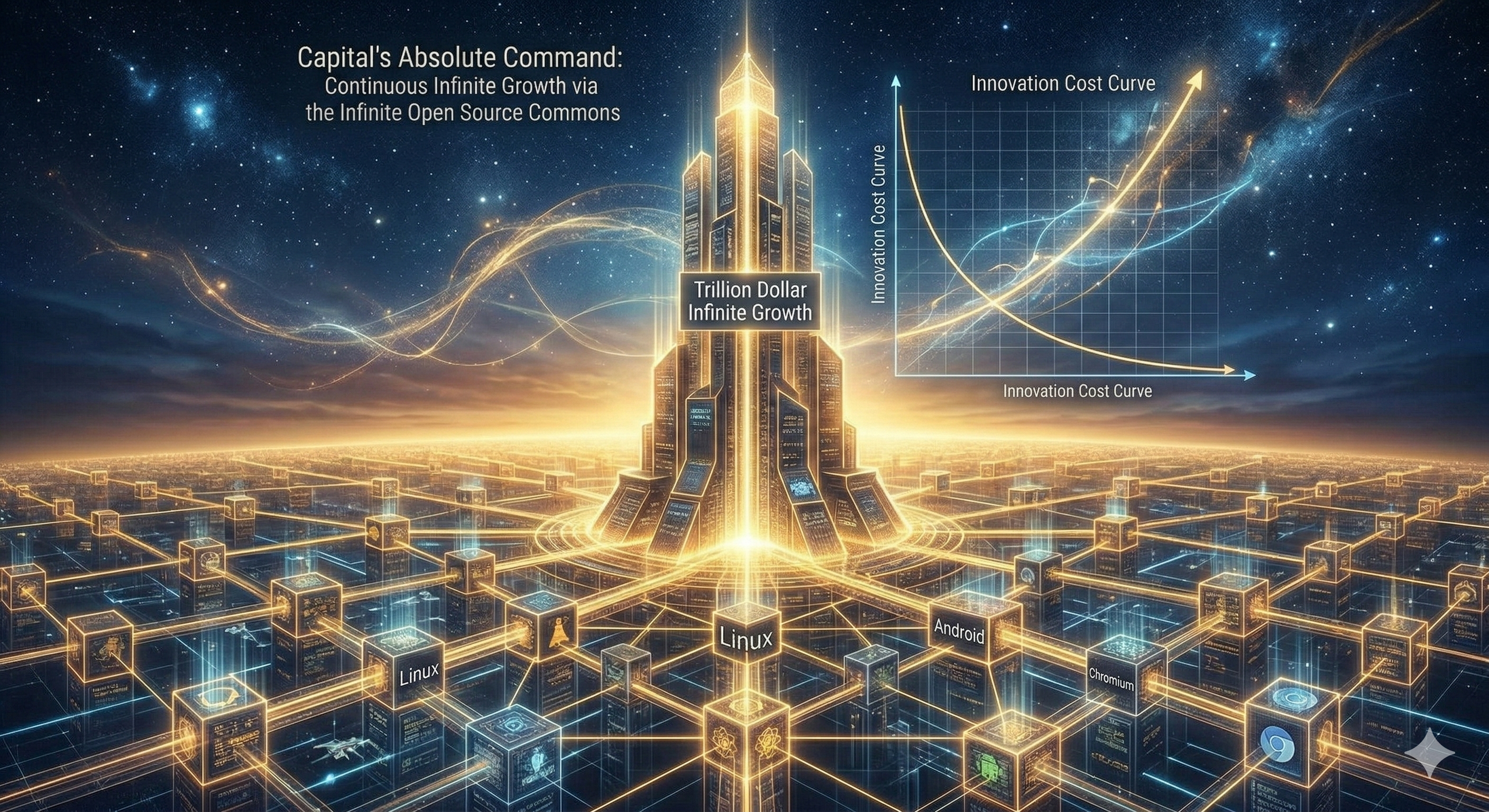 但这种“无限游戏”面临着一个致命的悖论:随着系统的无限扩张,技术栈的复杂度呈指数级爆炸。如果底层技术全部私有化,企业在进行“组合创新”时,将面临天文数字的知识产权交易成本[9]和沟通摩擦力。为了不被自身庞大的复杂性压垮,资本主义的增长机器必须在底层剥离出一块巨大的、非商品化的(De-commodified)“创新公地”。全行业的体量越大,这块公地的底座就必须越深厚。