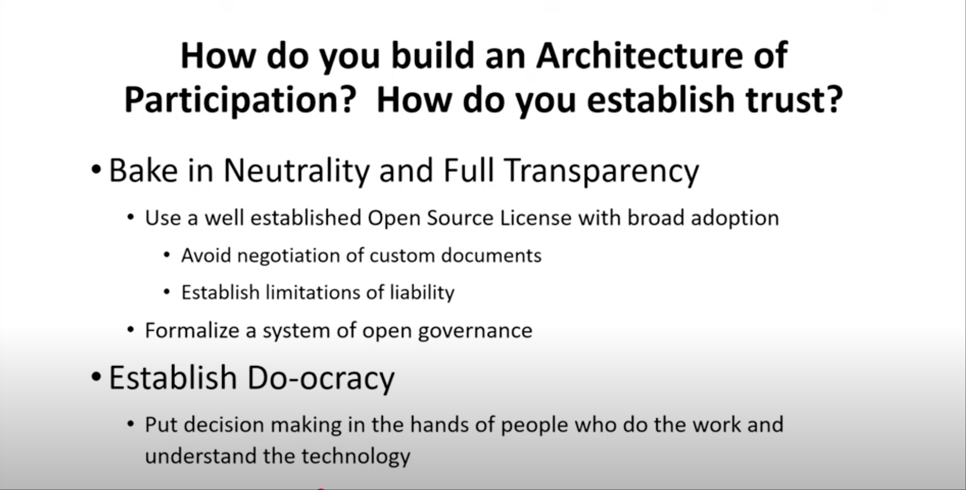 那么,你如何构建“参与架构”(architecture of participation)?这是蒂姆·奥莱利(Tim O’Reilly)早在开源旅程初期就提出的金句:搭一个框架,把人们聚到一起,并让他们在其中成功——这件事绝不简单。而它的根基只有两个字:信任。如果参与者担心日后会被“坑”,担心别人占便宜,就没人愿意加入。因此,你必须在协作环境里内置“中立”与“完全透明”。