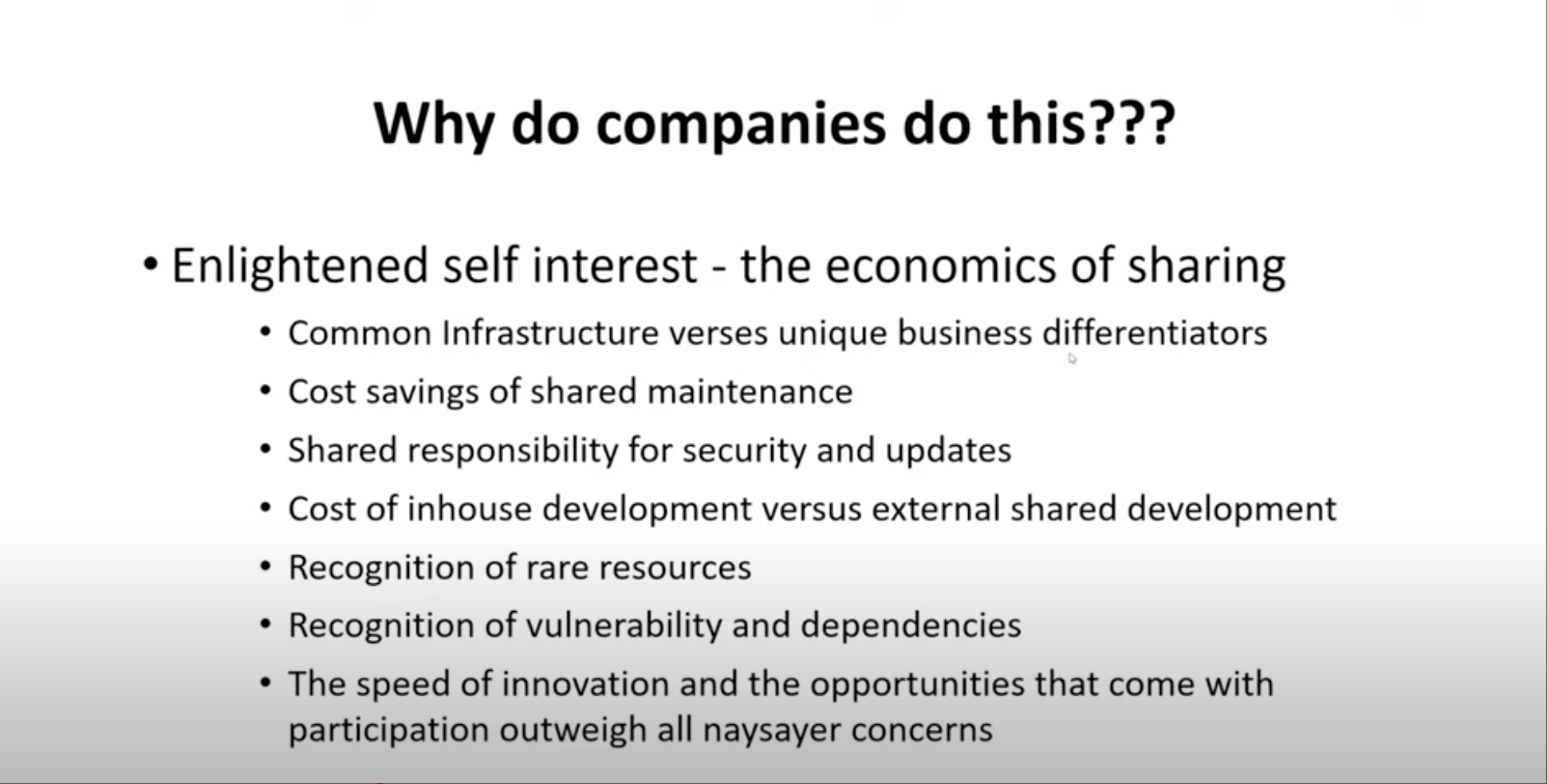 所以我想提醒你们:今天共建全球软件基础设施的企业协作生态,正是一份“参与架构”的样板间——它让稀缺专家无需逐家公司谈判、无需一次次谈责任限制、谈保密协议,就能即时汇聚、即时开工。如果能把这套“共享—免责—透明”机制复制到其他关键领域,下次再遇深水井、电网、疫苗或供应链危机时,我们就不必看着油喷几个月却束手无策。Ken,幻灯片内容就这些;现在我把屏幕共享关掉,很高兴继续聊你想深入的话题。