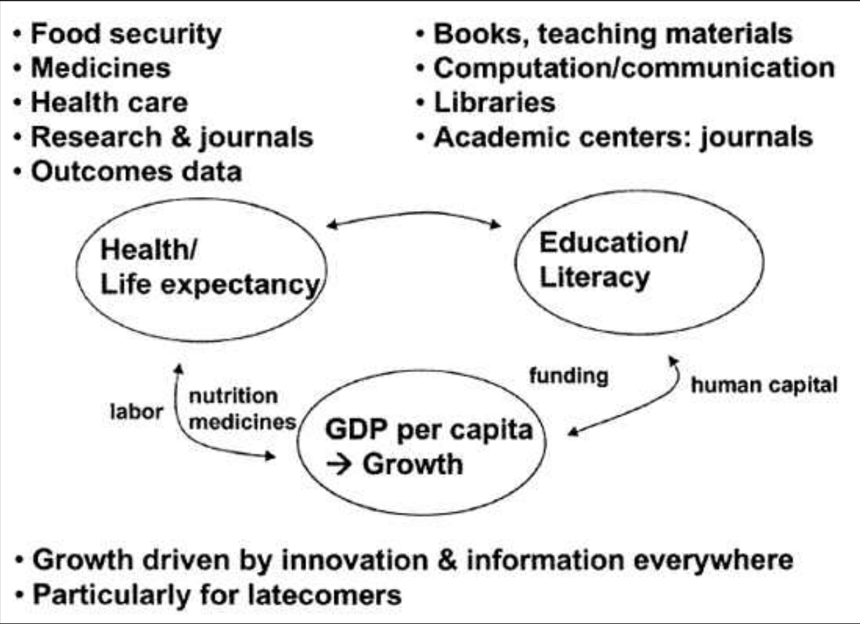 《人类发展报告》于 1990 年发起,旨在衡量一系列构成宜居生活和吸引力的要素。该报告的制定与以经济产出为中心的指标(如国内生产总值 (GDP) 或经济增长)截然不同,旨在更精确地了解一个国家经济和社会的哪些方面使其更宜居或更不宜居。它允许采取更细致入微的方法来改善各地的生活条件。正如森所指出的,中国、印度喀拉拉邦和斯里兰卡的人民比巴西或南非等人均收入更高的其他国家寿命更长、更健康。《人类发展报告》衡量了生活的方方面面。它追踪的主要综合指数是人类发展指数。人类发展指数试图捕捉人们长寿健康、知识渊博和拥有足够的物质资源来提供体面生活水平的能力。它通过结合三个主要组成部分来实现这一目标:出生时的预期寿命、成人识字率和入学率以及人均 GDP。如图 9.1 所示,在全球信息经济中,这些指标中的每一个都在很大程度上(但并非唯一地)取决于信息、知识以及信息嵌入商品和服务的获取情况。预期寿命受到充足营养和获得救命药物的影响。农业生物技术创新,以及种植技术方面的农艺创新和其他低技术创新模式,在提高社会自给自足能力和营养食品供应方面发挥了重要作用。药物依赖于药物研究及其产品的获取,医疗保健依赖于研究和出版,以开发和传播有关最佳护理实践的信息。毫不奇怪,教育也严重依赖于教学材料和设施的获取。这包括获取基本教科书、图书馆、计算和通信系统以及当地学术中心。最后,半个多世纪以来,经济增长一直被理解为主要由创新驱动。对于后来者来说尤其如此,他们可以通过采用其他地方开发的最佳实践和先进技术,然后根据当地情况进行调整,并利用通过这种方式获得的新技术平台,最快地改善自身状况。因此,这三个要素都受到信息、知识获取和使用的重大影响。网络信息经济的出现能够为人类发展带来巨大利益这一说法的基本前提是,我们产生新信息的方式——以及同样重要的,我们用来管理世界各地现有信息和知识存量的体制框架——能够对人类发展产生重大影响。
