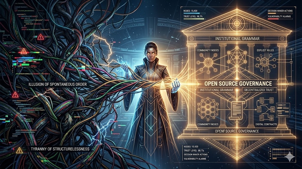 借由这五座思想的坐标,我们将暂时抽离代码合并的琐碎与社区日常的喧嚣,跃升至一种真正的“奥林匹亚视角(Olympian perspective)”。站在这座高峰上,我们将同时配戴上四副截然不同的透镜: * 用政治学的眼光,去审视公地的自治与权力的制衡; * 用制度经济学的刻刀,去解剖契约的成本与剩余控制权的分配; * 用管理学的逻辑,去测量组织形态的边界与演化; * 用社会/人类学的温度,去凝视数字工匠们的声誉、动机与社会资本。