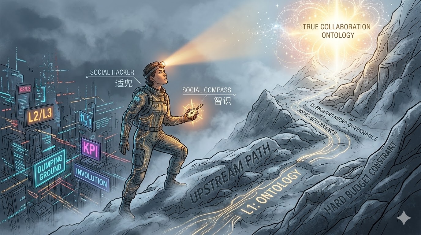 这篇文本,是一份职业的重构宣言。我决定停止向那些依靠“软预算约束”维系的科层制系统兜售开源的幻象,不再为其提供任何迎合工具理性的操作指南。我将调转方向,从被规训的、充满营销噪音的下游,向着开源生命力真正涌现的“上游”(Upstream)进发。去追问开源的本体,去重塑作为一名社会黑客(Social Hacker)的真实坐标。