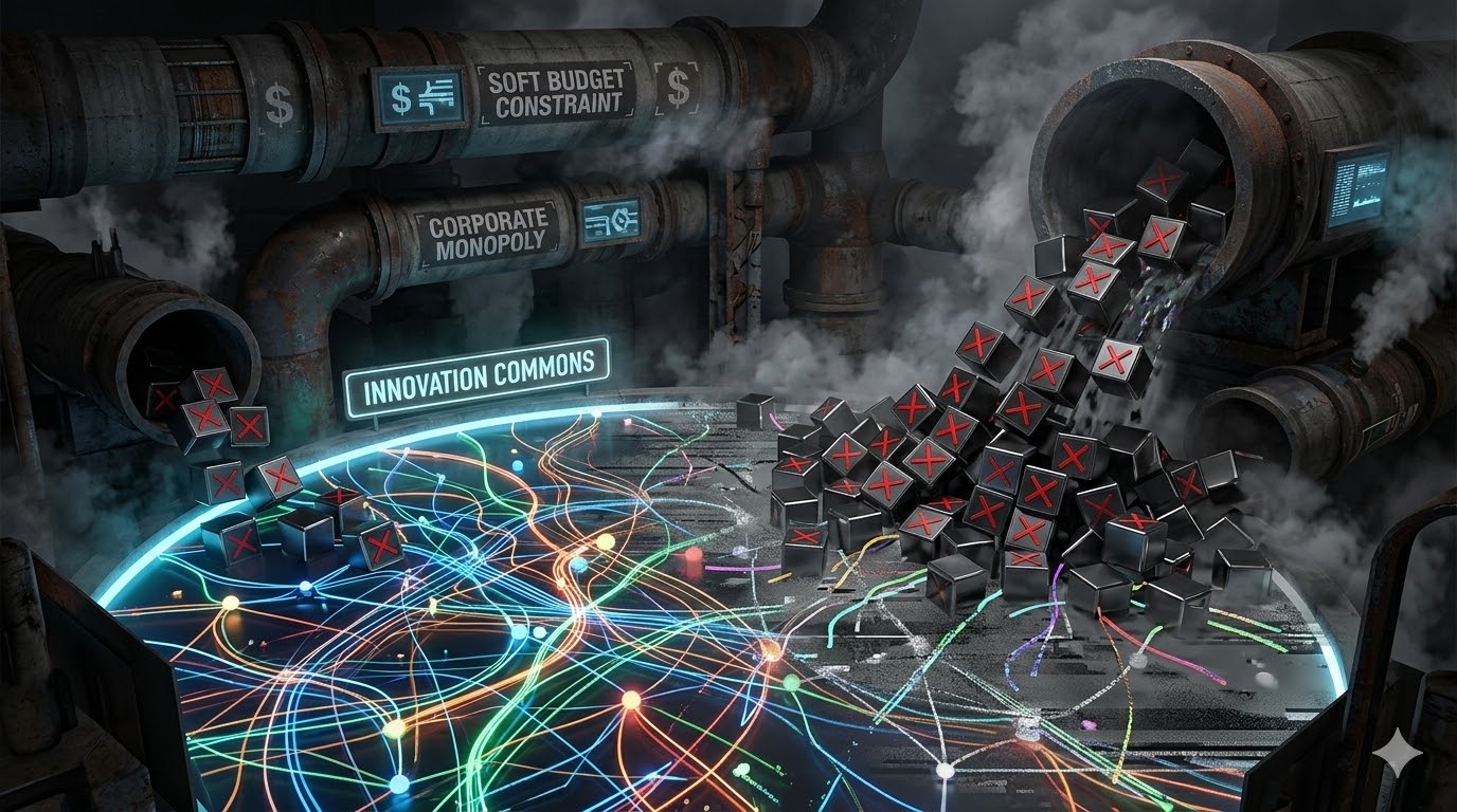 在缺乏 Level 2(产权界定与可信契约)的盐碱地上,原本极其珍贵的“创新公地(Innovation Commons)”[3]被彻底无视。被工具理性彻底夺舍的巨头们,并不将开源视为需要共同维护的生态基座,而是将其当作一个可以无限索取、毫无成本的资源池。当狂热的“搭便车者(Free-rider)”以“软预算约束”肆意挥霍着技术共同体积累了数十年的信任与智力资产,甚至用“倾倒式权重”来污染水源时,在下游修补任何治理框架,都成了一种徒劳的自我欺骗。