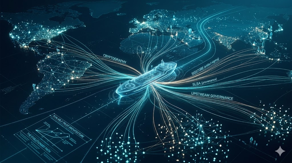信任并没有消失,它只是在发生转移。它正从“权威机构的公章”,向下沉淀到我们之前推演的 L_Meta(元规则层)。未来的安全与信任,不再依赖于裁判的滞后宣判,而是由系统架构内建的密码学证明(如代码无密钥签名 Sigstore)、去中心化的可观测性溯源以及自动化的动态契约验证来接管。旧的灯塔熄灭了,是因为整片海洋都已经亮起了去中心化的点点荧光。