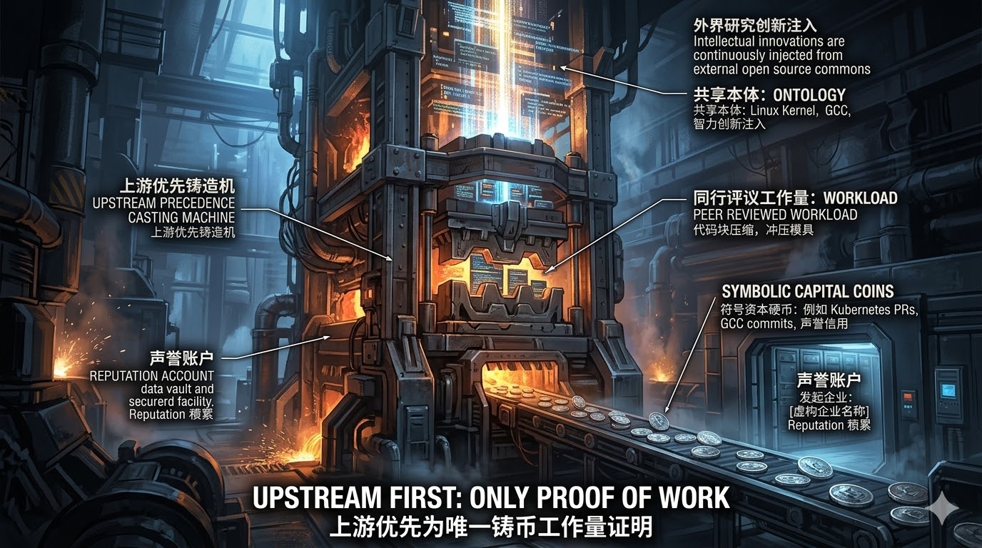 在传统的法币体系中,铸币权被主权国家的中央银行垄断。但在去中心化的开源共同体中,符号资本的铸币机制遵循着一种极其古老且严苛的“工作量证明”(Proof of Work)。这种证明机制的铁律,被凝练为一个广为人知的行事准则——“上游优先”(Upstream First)。