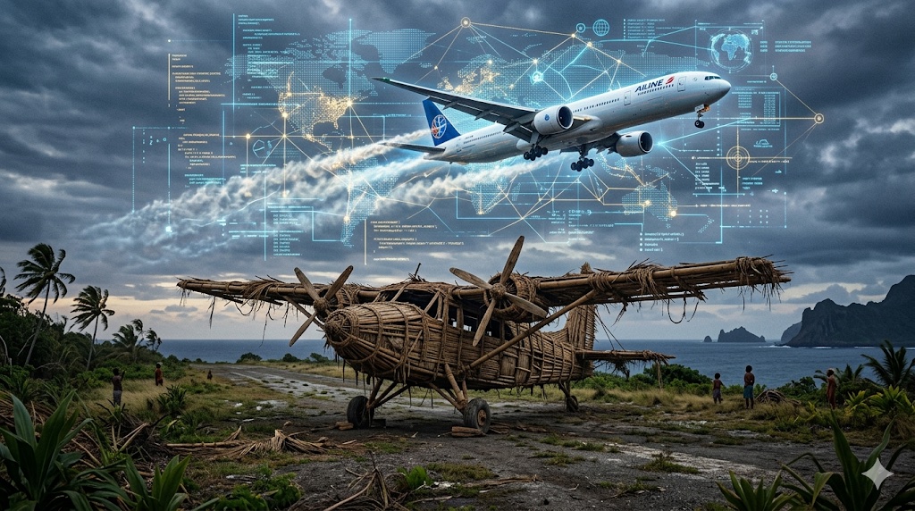 二战后太平洋岛屿上的原住民,用木头削成天线的形状,在跑道上点燃火把,试图召唤曾经带来丰富物资的美军飞机。今天的许多本土 AI 宣告,与这些原住民何其相似: